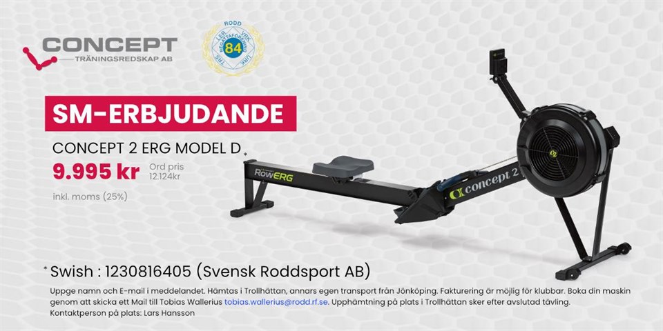 De maskiner som tävlas på kommer att säljas ut efter tävlingen av Concept Träningsredskap och priset är 9995kr per maskin. Just nu finns det 6st osålda maskiner kvar och det är först till kvarn som gäller. Är ni intresserade av att köpa en roddmaskin så kontakta Tobias Wallerius på mejl tobias.wallerius@rodd.rf.se